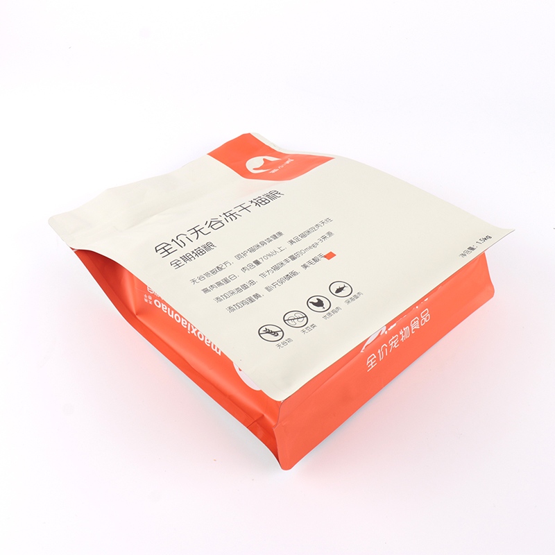 พื้นผิวของถุงอาหารสุนัขแบบมีซิปทำจากวัสดุเคลือบด้านหนา ข้อมูลเช่นรสชาติและอายุการเก็บรักษาของอาหารสัตว์เลี้ยงที่พิมพ์ไว้มีความชัดเจนเป็นพิเศษและไม่เกิดรอยขีดข่วนได้ง่ายด้วยกรงเล็บ
