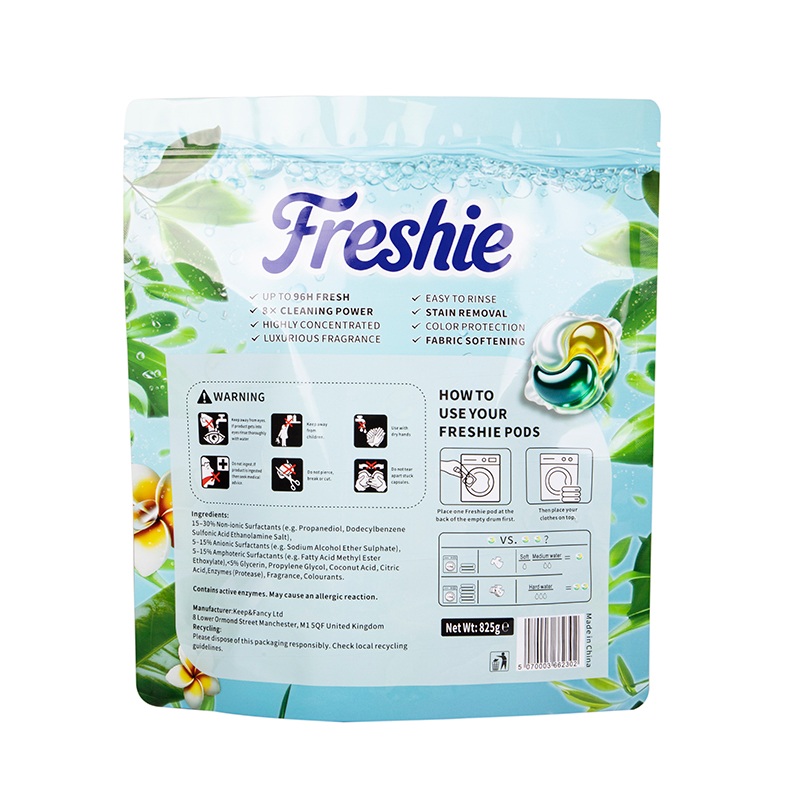 นอกจากนี้ยังมีพื้นที่ทำเครื่องหมายแบบเรียบง่ายที่ด้านข้างของถุง ซึ่งสะดวกในการแยกแยะว่าประกอบด้วยผงซักฟอกซักผ้า ผงซักผ้า หรือน้ำยาปรับผ้านุ่ม